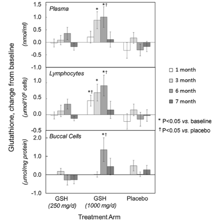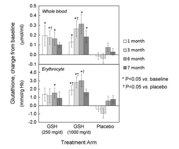 The results indicated that GSH levels in blood increased significantly after one, three, and six months compared to baseline in both the low-dose and high-dose GSH groups, while no such increase was observed in the placebo group. Notably, at six months, mean GSH levels in erythrocytes, plasma, and lymphocytes had increased by 30-35% in the high-dose group, which was significantly greater than the increases observed in the placebo group. In exfoliated buccal cells, a remarkable 260% increase in GSH levels was observed in the high-dose group at six months, again highlighting the effectiveness of GSH supplementation.